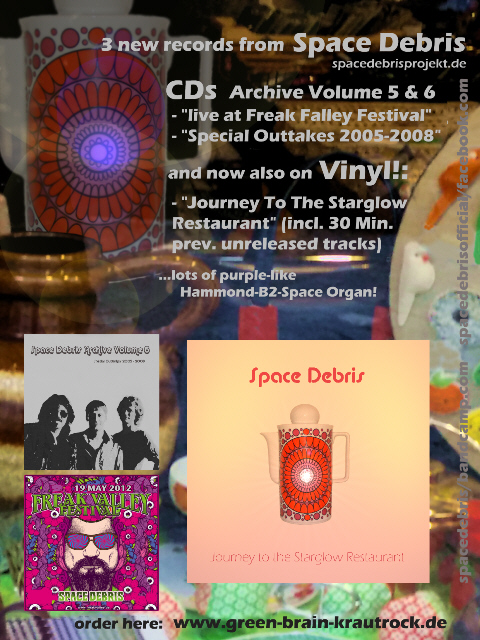 first time on vinyl: DLP- "Journey To The Starglow Restaurant": (incl. 30 min prev. unreleased bonuslongtracks from the original sessions 2007) "The title track of the ‘Journey to the Starglow Restaurant’ LP, is brilliant. I do like to listen to up front drummers, too many of them remain in the background repeating basic patterns but Christian, in the afterglow of great jazz drummers, is energetic and a driving force to the lead musicians rather than accepting mere subservience, he is a leader, bringing out the best in the guitar and organ maestros and propelling their solos into the aether. The music really comes alive on vinyl."(Phil Jackson/Acid Dragon-Printmagazine 2020) and 2 new archive CDs: Archive Vol 5 (Freak Valley Festival 2012): + Archive Vol 6 (prev. unreleased Special Outtakes from 2005-2008 with Tom Kunkel/Hammond): Our new live DLP/2CD/MC since may/2018: Titel: „Mountain Ultimate“ This is the most complete and maybe the best live performance of Space Debris at the wonderful and perfectly organized festival „World-Music-Festival-Loshausen'. The band playes in front an audience that is dancing permanently in spite of the nocturnal rain. A heavy hammond sound delivers the foundation for a dominant guitar play and an amazing bass groove of the meanwhile fully integrated femal bass player Vroni Frisch, who delivers an extra kick. The album contains all songs from the gig, including the Space Debris classic 'Mountain' in a 20 minutes long version. The band plays this track since more than 10 years and develops and modifies it permanently. „Spacedelic Odyssey' contains a complete concert in Jazzkeller Hofheim 2016. The bass was played by Janni Schmitt (known by the last Miller Anderson and Pete York concerts), who already participated on the Space Debris album 'Behind The Gate'. The experimental Keyboards are a little bit more dominant than at the Loshausen gig. This concert is available for the very first time on a lovingly created music cassette! A must for analogous fans! The double fold insert contains many live pictures. DLP „Mountain Ultimate“ 2CD „Mountain Ultimate“ (incl. “Spacedelic Odyssey”-Bonus CD) MC “Spacedelic Odyssey” Mountain Ultimate - Besetzung: Tommy Gorny, Winnie Rimbach Sator, Christian Jäger , Vroni Frisch / 2017 Tracklists: Mountain Ultimate DLP: A1.Nightslider A2. Sublunar Overdrive A3 Happy Saucer B1 Mountain Ultimate C1 Interstellarus Rex C2 Transhuman D1 Into The Earth D2 Nodus (Bonus) 2CD "Mountain Ultimate": CD1 Main: > 1 Nightslider 2 Sublunar Overdrive 3 Happy Saucer 4 Mountain Ultimate 5 Interstellarus Rex 6 Transhuman 7 Into The Earth CD2 Bonus (Spacedelic Odyssey): 1 Nodus 2 Interstellarus Rex II 3 Ur 4 Dump Diver 5 Spacedelic Odyssey 6 Into The Hall MC-80-cassette-tape "Spacedelic Odyssey" Spacedelic Odyssey - musicans: Tommy Gorny, Winnie Rimbach Sator, Christian Jäger, Janni Schmidt / 2016 Seite 1: Nodus - Interstellarus Rex II - Ur Seite 2: Dump Diver - Spacedelic Odyssey - Into The Hall and here is our newest studio-CD or DLP: