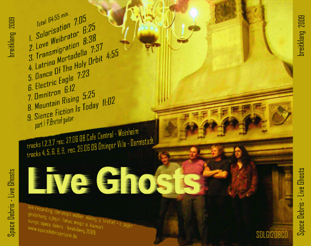 first time on vinyl: DLP- "Journey To The Starglow Restaurant": (incl. 30 min prev. unreleased bonuslongtracks from the original sessions 2007) "The title track of the ‘Journey to the Starglow Restaurant’ LP, is brilliant. I do like to listen to up front drummers, too many of them remain in the background repeating basic patterns but Christian, in the afterglow of great jazz drummers, is energetic and a driving force to the lead musicians rather than accepting mere subservience, he is a leader, bringing out the best in the guitar and organ maestros and propelling their solos into the aether. The music really comes alive on vinyl."(Phil Jackson/Acid Dragon-Printmagazine 2020) and 2 new archive CDs: Archive Vol 5 (Freak Valley Festival 2012): + Archive Vol 6 (prev. unreleased Special Outtakes from 2005-2008 with Tom Kunkel/Hammond): Our new live DLP/2CD/MC since may/2018: Titel: „Mountain Ultimate“ This is the most complete and maybe the best live performance of Space Debris at the wonderful and perfectly organized festival „World-Music-Festival-Loshausen'. The band playes in front an audience that is dancing permanently in spite of the nocturnal rain. A heavy hammond sound delivers the foundation for a dominant guitar play and an amazing bass groove of the meanwhile fully integrated femal bass player Vroni Frisch, who delivers an extra kick. The album contains all songs from the gig, including the Space Debris classic 'Mountain' in a 20 minutes long version. The band plays this track since more than 10 years and develops and modifies it permanently. „Spacedelic Odyssey' contains a complete concert in Jazzkeller Hofheim 2016. The bass was played by Janni Schmitt (known by the last Miller Anderson and Pete York concerts), who already participated on the Space Debris album 'Behind The Gate'. The experimental Keyboards are a little bit more dominant than at the Loshausen gig. This concert is available for the very first time on a lovingly created music cassette! A must for analogous fans! The double fold insert contains many live pictures. DLP „Mountain Ultimate“ 2CD „Mountain Ultimate“ (incl. “Spacedelic Odyssey”-Bonus CD) MC “Spacedelic Odyssey” Mountain Ultimate - Besetzung: Tommy Gorny, Winnie Rimbach Sator, Christian Jäger , Vroni Frisch / 2017 Tracklists: Mountain Ultimate DLP: A1.Nightslider A2. Sublunar Overdrive A3 Happy Saucer B1 Mountain Ultimate C1 Interstellarus Rex C2 Transhuman D1 Into The Earth D2 Nodus (Bonus) 2CD "Mountain Ultimate": CD1 Main: > 1 Nightslider 2 Sublunar Overdrive 3 Happy Saucer 4 Mountain Ultimate 5 Interstellarus Rex 6 Transhuman 7 Into The Earth CD2 Bonus (Spacedelic Odyssey): 1 Nodus 2 Interstellarus Rex II 3 Ur 4 Dump Diver 5 Spacedelic Odyssey 6 Into The Hall MC-80-cassette-tape "Spacedelic Odyssey" Spacedelic Odyssey - musicans: Tommy Gorny, Winnie Rimbach Sator, Christian Jäger, Janni Schmidt / 2016 Seite 1: Nodus - Interstellarus Rex II - Ur Seite 2: Dump Diver - Spacedelic Odyssey - Into The Hall and here is our newest studio-CD or DLP: